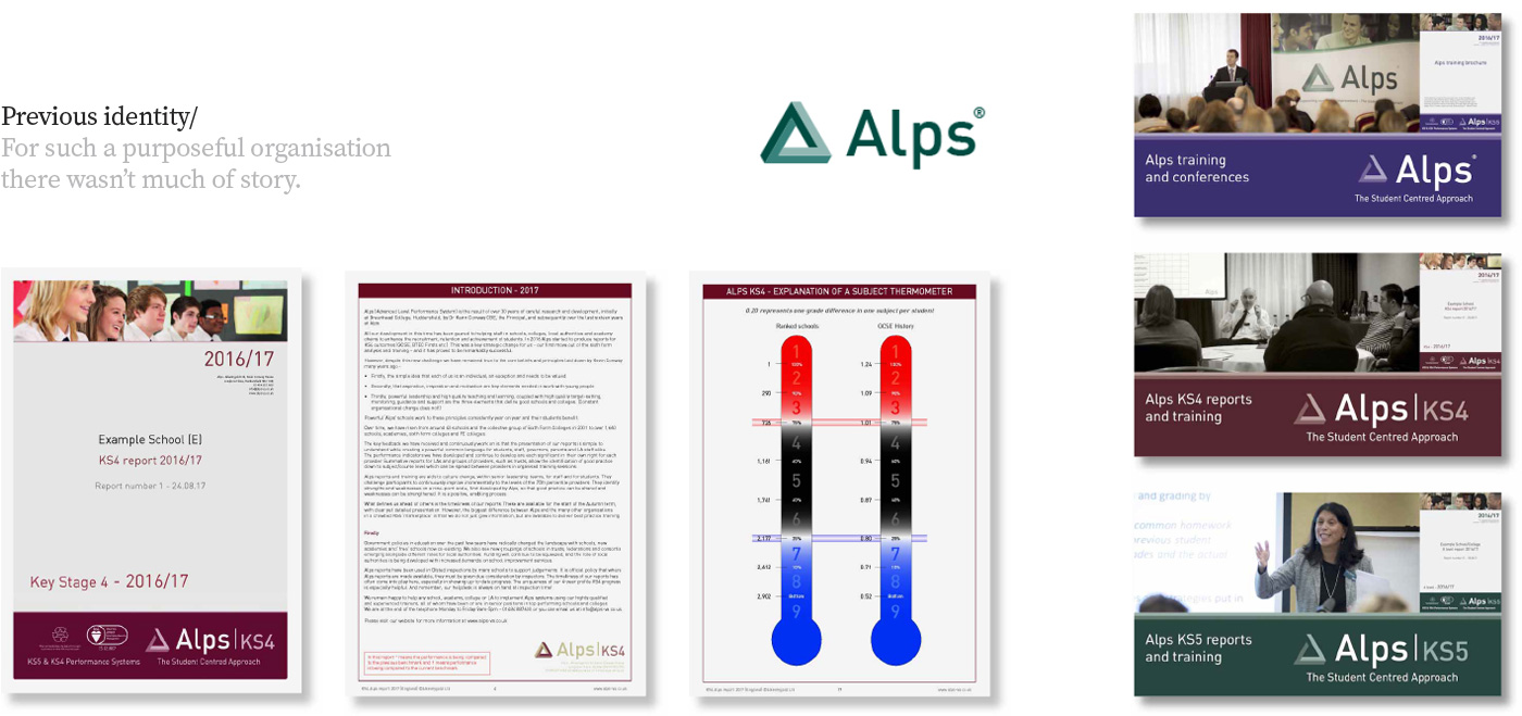 Alps offers data analysis tools to the education sector to guide both strategic and classroom level decision making. Their strong sense of purpose and values were not reflected in their brand communications. Most materials were complex, inconsistent and a little too academic in tone. They needed a stronger and clearer proposition to communicate their difference, an inspirational concept to appeal to like-minded teachers and educational leaders, with simplified messaging to convey what was often perceived as a complicated process.