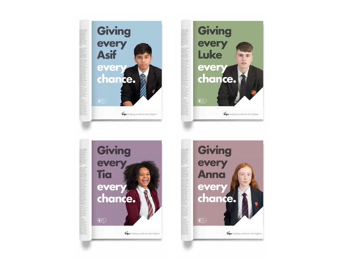 The headline ‘Giving every student every chance’ led our communications and was developed to include individual names such as ‘Giving every Tom every chance’. Our photography of individual student portraits was intentionally very real and emotive to stand out from the staged images depicting a rose-tinted view of student life, typical of the education sector. Our aim was to bring to life the fact that behind the data there are real people with real hopes for their future – it’s not the numbers that matter but the people behind them.