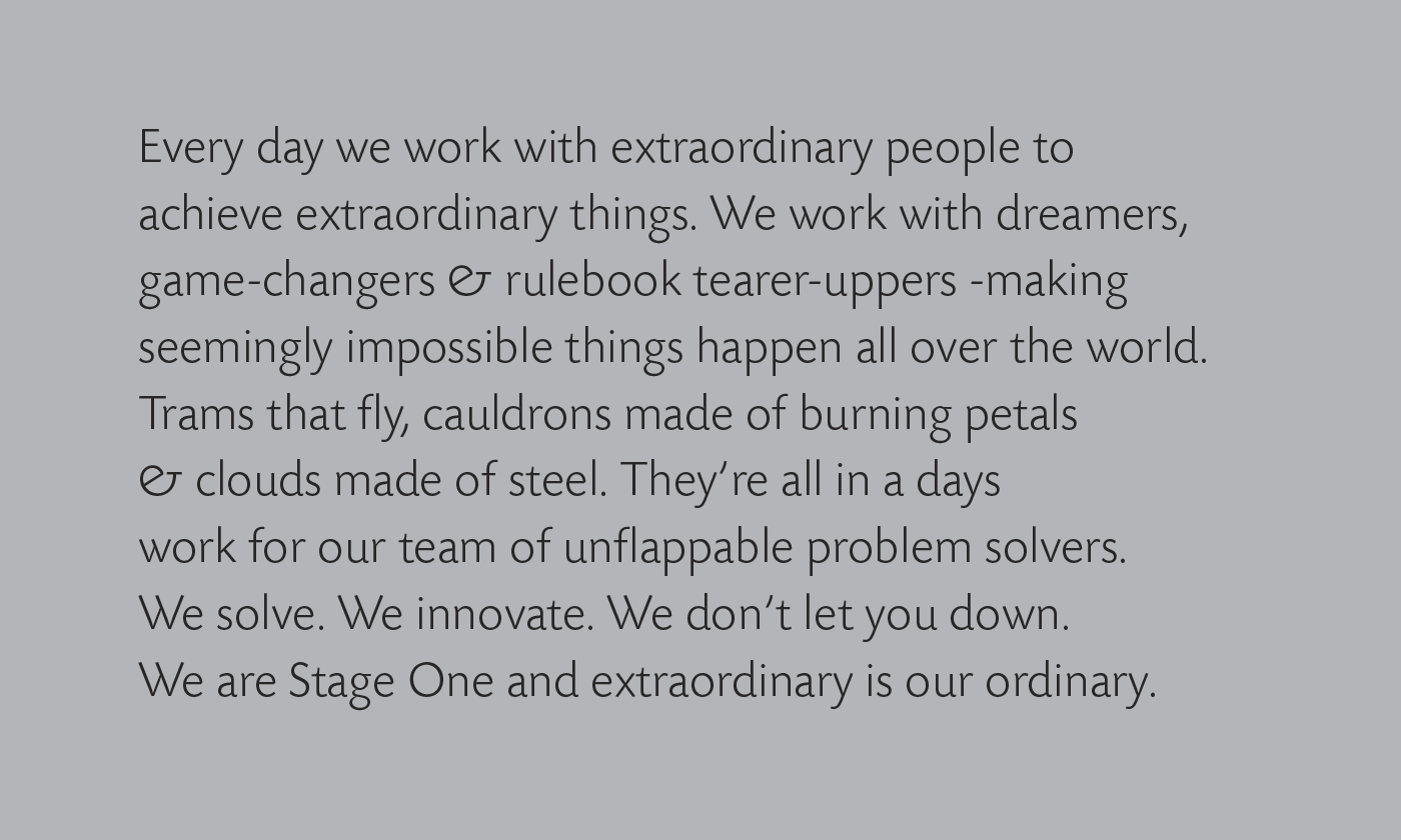 We didn’t want to lose the undoubted wow-factor of their extraordinary work, but amplified the human qualities that truly made them special. We realised that clients went to Stage One for the really difficult jobs, because they knew they were fantastic problems solvers who could innovate, iron out problems and realise pretty much anything.