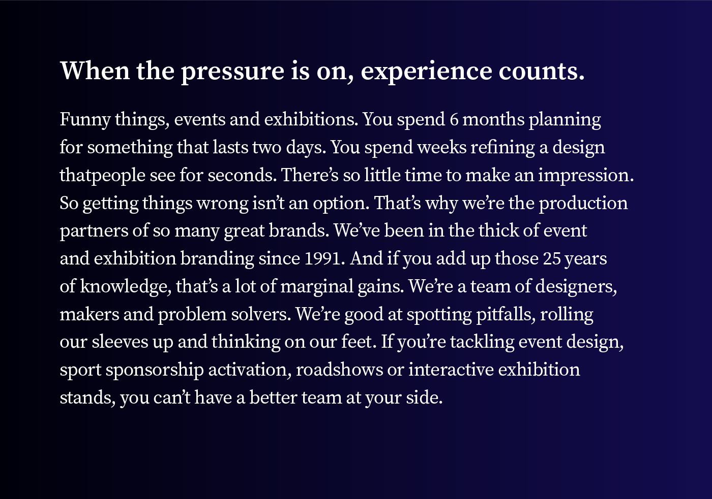 Henson Franklyn’s clients love them. Which is a great starting point for any brand. We dug a little deeper to find out why and discovered that their specialist knowledge was what made all the difference. Clients can spend a year planning for an event that lasts a day, so stress levels can go through the roof if things don’t come together as planned. In those moments an exhibition and events partner that really knows its stuff is worth a premium. So we built their brand around the proposition: ‘knowledge that makes all the difference when it matters most’.