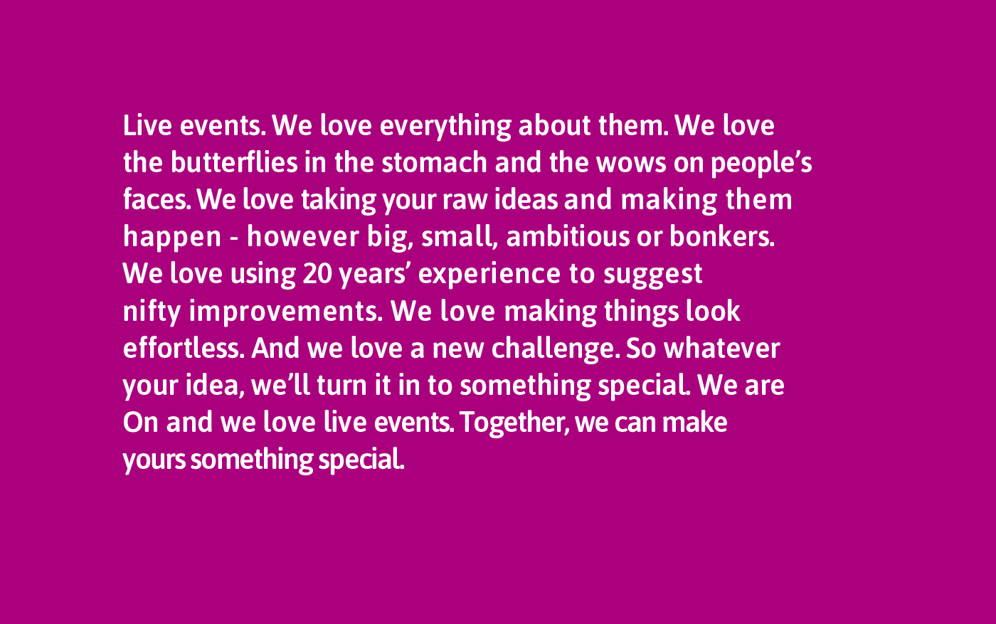 We got talking to a brilliant events production company that had events and live music in its soul. Yet its name was Panda AV. Not very rock ‘n’ roll. The split between corporate events and live music was also pulling the company apart. So we completely rebranded them – giving them a sharp, modern brand that worked equally well in both arenas.